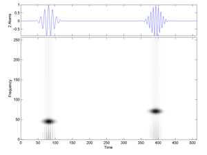 Fig.23 Wigner-Ville Time-Frequency Distribution of two Gabor atoms (colormap gray scale version). Note the interference component.